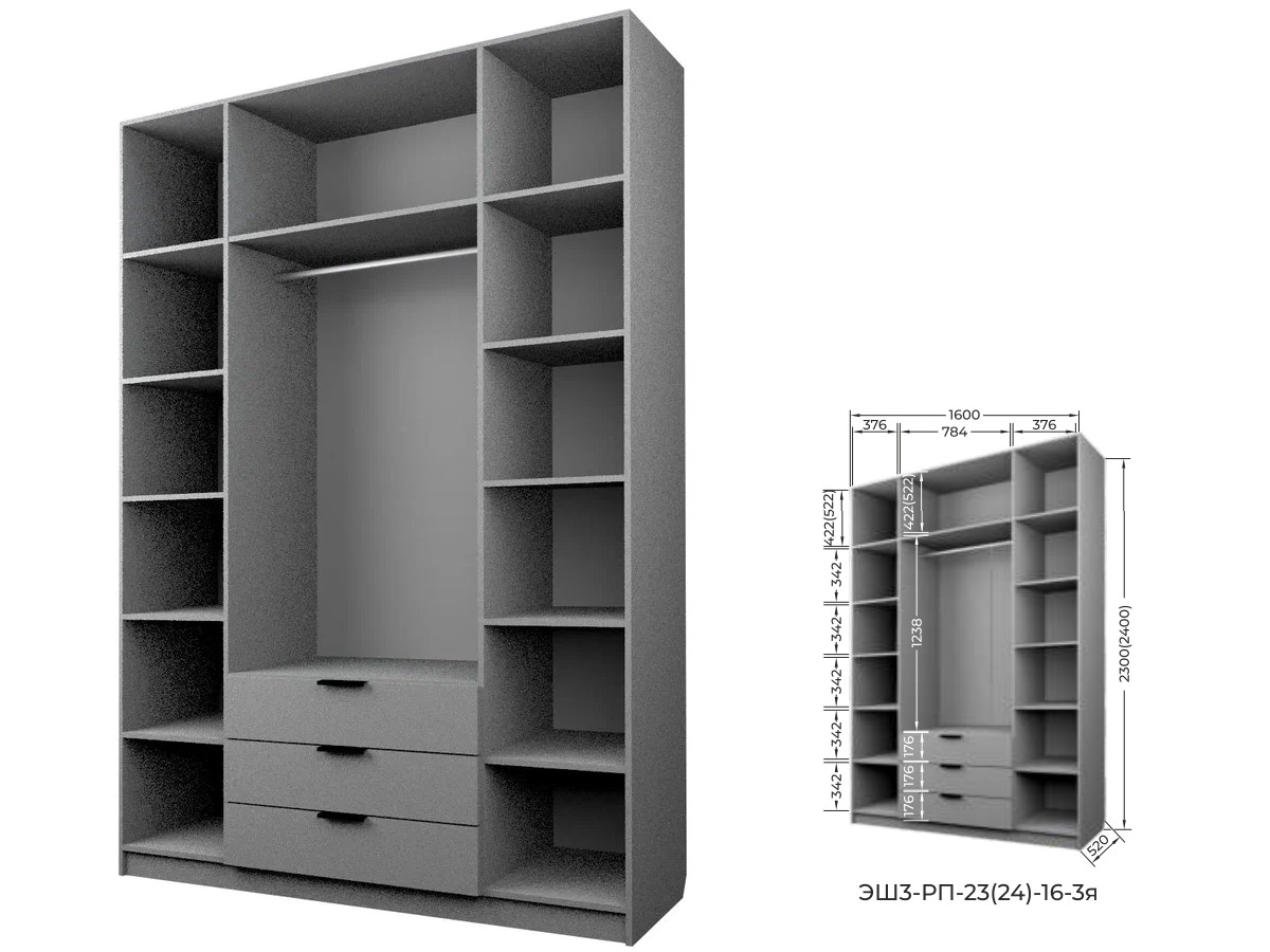 Комплект: ЭШ3-РП-23-16-3я, Шкаф с 3 ящиками + два ЗС-23-3я,Зеркало для шкафов ЭШ 2300 мм